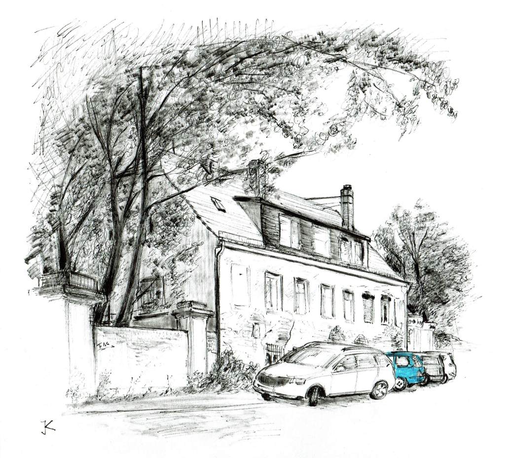 This sketch shows the Schösserhaus in Kantatenweg / Leipzig, where Johann Sebastian Bach wrote his „Peasant Cantata“. Today the site of the former manor is very run down. I used an HB pencil as the basis for the drawing and then continued to work with fineliners.