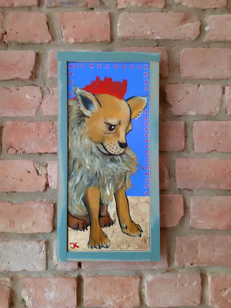 Das Bild eines Chihuahua ist eine Gouachemalerei auf Karton (ca. 40 x 20 cm). Der Rahmen ist aus Beschnittresten von MDF gefertigt.